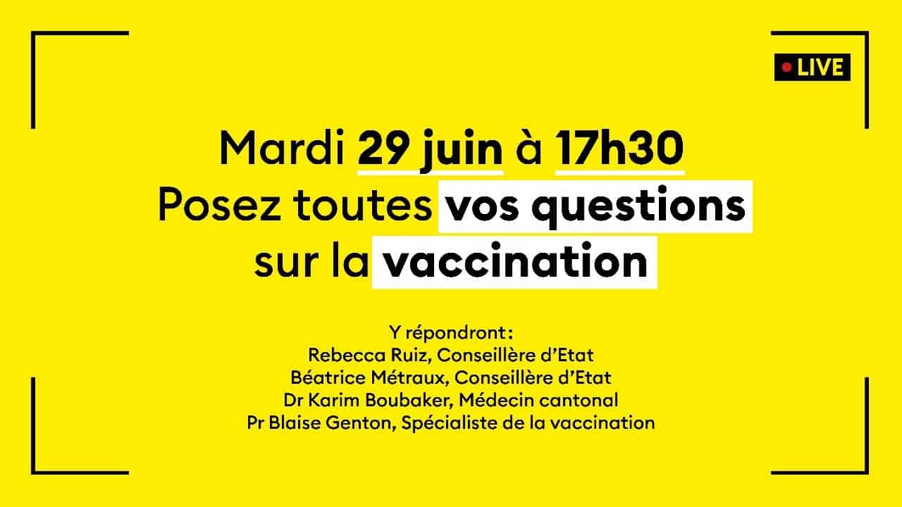 Rendez-vous mardi 29 juin 2021 dès 17h30 sur cette page Y répondront en direct : Les conseillères d’Etat R. Ruiz et B Métraux, le médecin...