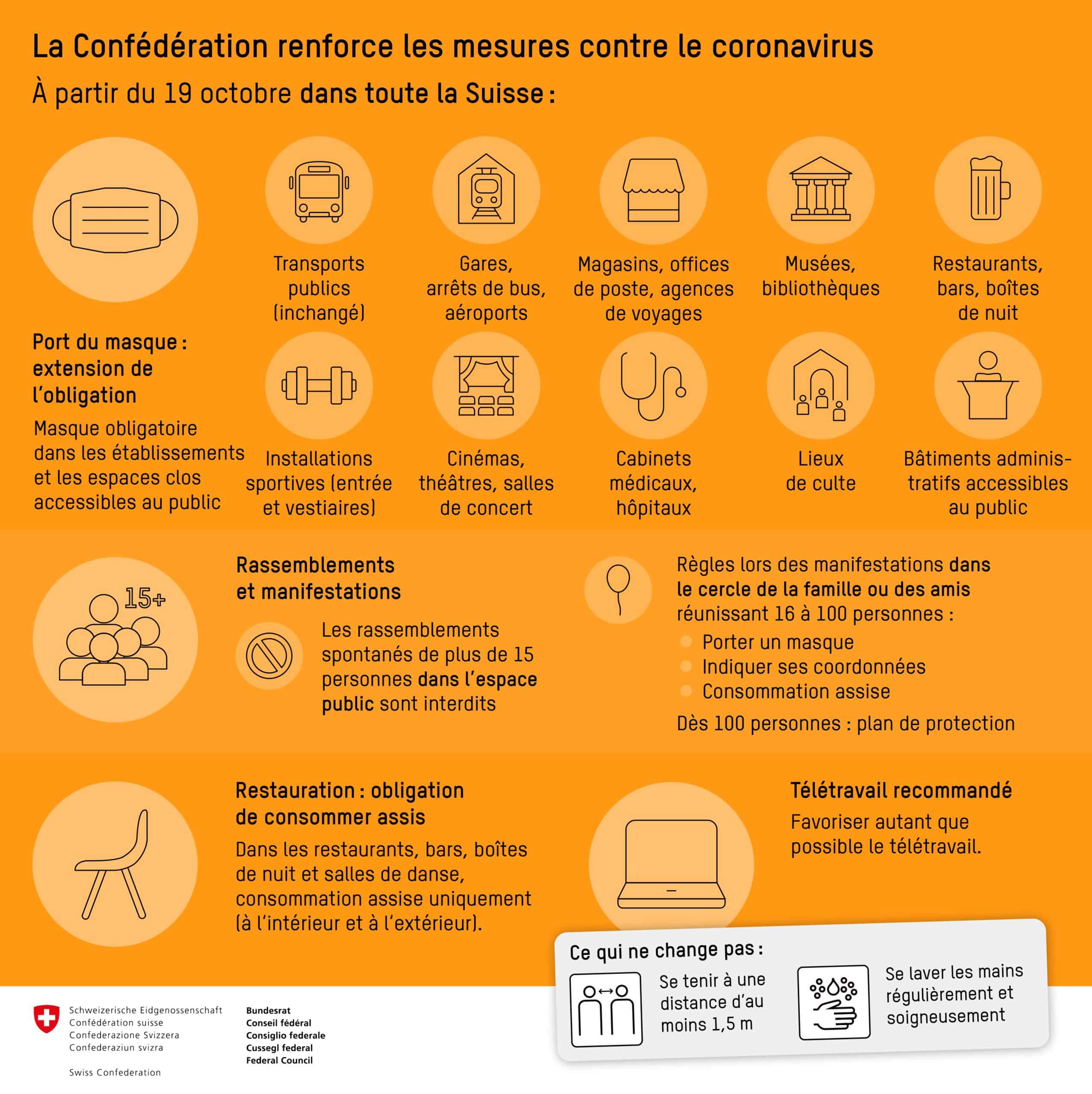 Coronavirus : restrictions pour les manifestations privées, interdiction des rassemblements publics de plus de 15 personnes, obligation du port du masque étendue et télétravail recommandé Berne,...
