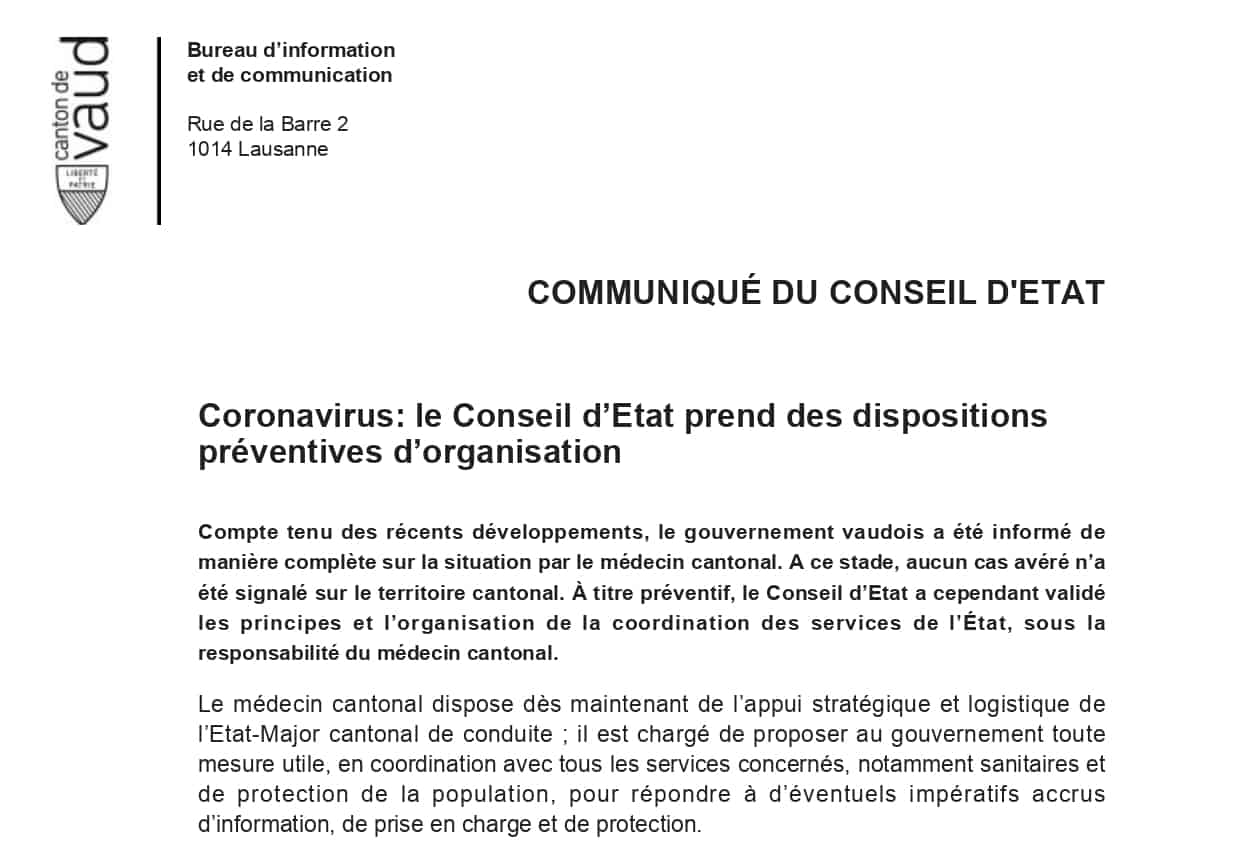 COMMUNIQUÉ DU CONSEIL D’ÉTAT VAUDOIS Publié le 27 février 2020 Compte tenu des récents développements, le gouvernement vaudois a été informé de manière complète sur la...