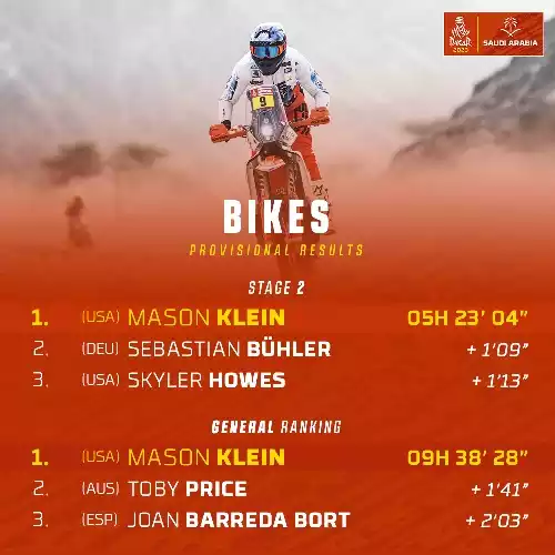 Côté motos, l’Australien Daniel Sanders confirme son statut de favori indétrônable. Pilote KTM, il a enchaîné les performances impressionnantes depuis le début du rallye.