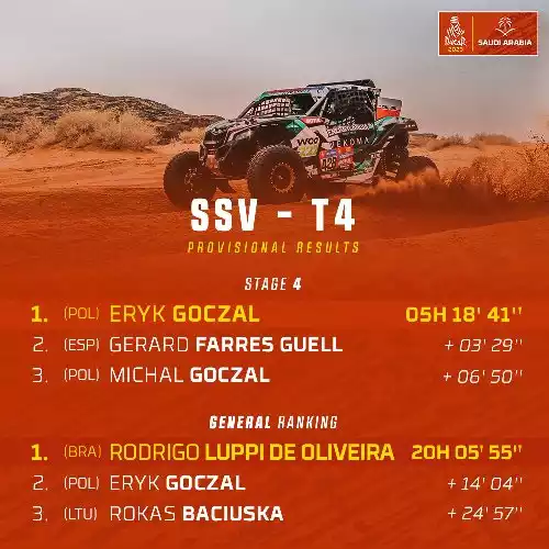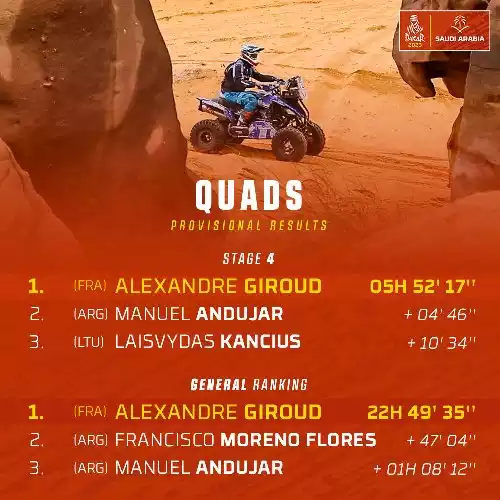 Devant, Yazeed al-Rajhi a su tirer profit de ces péripéties. Sur sa Toyota, le Saoudien a adopté un rythme parfait, alternant vitesse et gestion, pour finir la journée en tête avec une avance d’une minute sur al-Attiyah. À bord de sa Dacia, l’émirati n’a rencontré aucun souci technique, une rareté dans ce type d’épreuve.