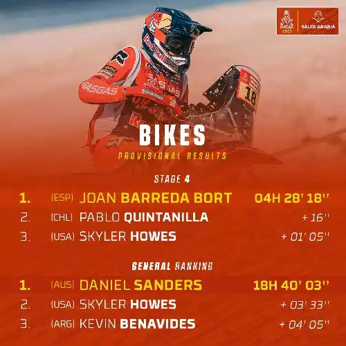 Côté motos, l’Australien Daniel Sanders confirme son statut de favori indétrônable. Pilote KTM, il a enchaîné les performances impressionnantes depuis le début du rallye.
