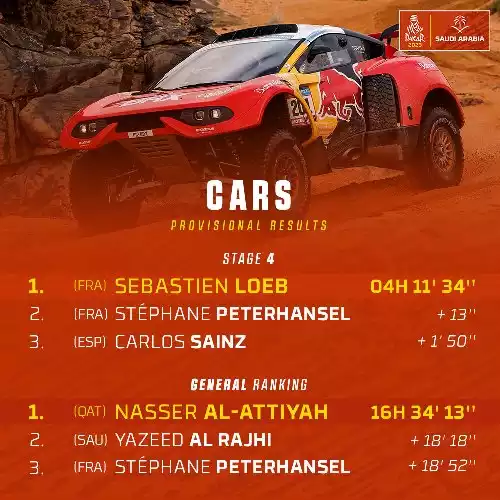 - Sébastien Loeb, lui aussi favori, a été victime d’une série de contretemps. Bloqué dans les dunes pendant quinze minutes, il a dû compter sur l’aide de son équipière Cristina Gutierrez. Plus tard, des problèmes électriques l’ont à nouveau immobilisé, le reléguant à plus de 30 minutes du leader.