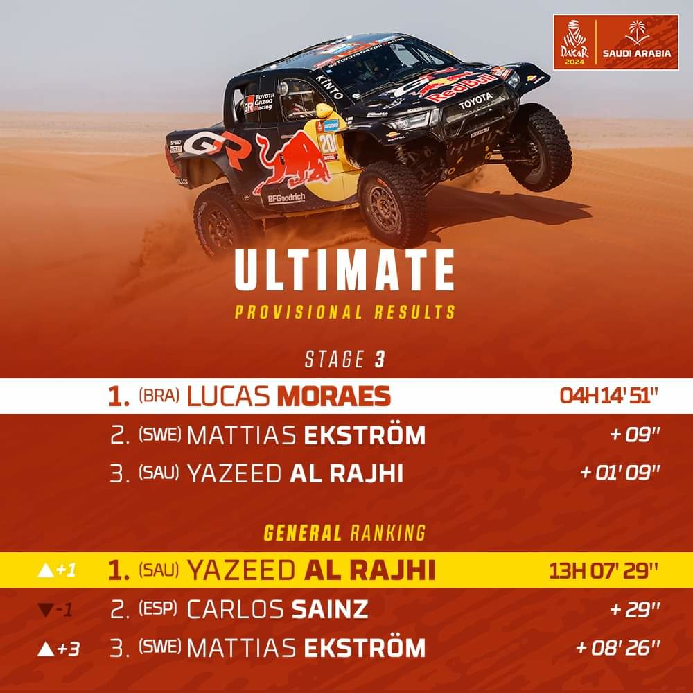 Devant, Yazeed al-Rajhi a su tirer profit de ces péripéties. Sur sa Toyota, le Saoudien a adopté un rythme parfait, alternant vitesse et gestion, pour finir la journée en tête avec une avance d’une minute sur al-Attiyah. À bord de sa Dacia, l’émirati n’a rencontré aucun souci technique, une rareté dans ce type d’épreuve.