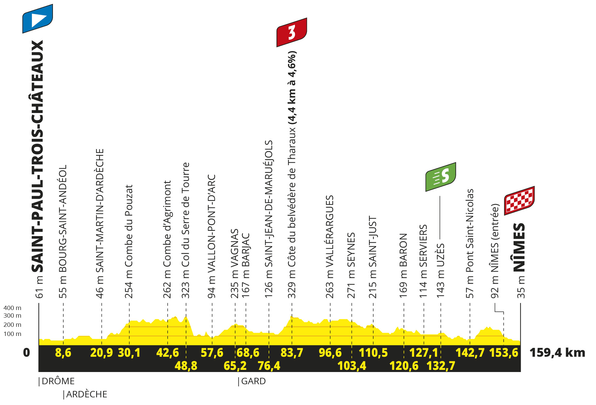 Cette 12e étape du Tour de France 2021, d’une distance de 159.4km et qui débutera à 13h40, partira de Saint-Paul-Trois-Châteaux pour rejoindre Nîmes.