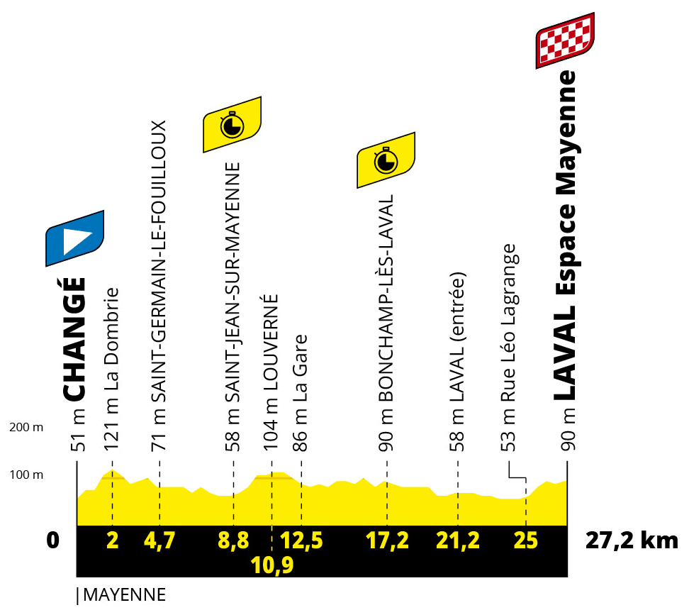 Premier des deux contre-la-montre individuels programmés sur ce Tour, sur un parcours inhabituellement long en première semaine. Une possibilité de venir bouleverser en partie l’ordre établi durant les escapades bretonnes.