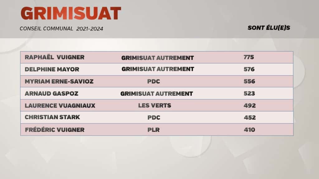 A Grimisuat, la candidate verte Luarence Vuagniaux fait son entrée au conseil communal au détriment du PS. Le PDC perd un siège et Grimisuat Autrement en gagne un.